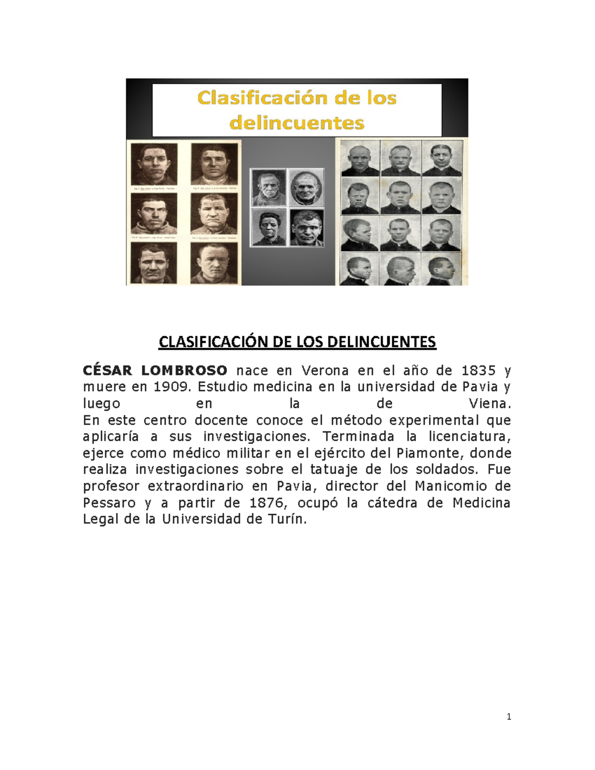 más importante de los criminales, la cual fue base para otras y se le consideró el padre de la criminología. César Lombroso, italiano, médico, literato, antropó-logo, criminólogo y militar, falleció en Turín el 18 de octubre de 1909 a los 75 años. La clasificación antropológica de los delincuentes: Identificar por rasgos
