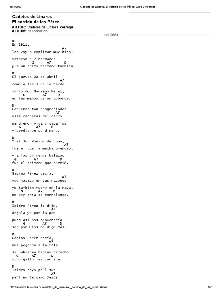 Cadetes de Linares, El Corrido de Los Pérez Letra y Acordes PDF