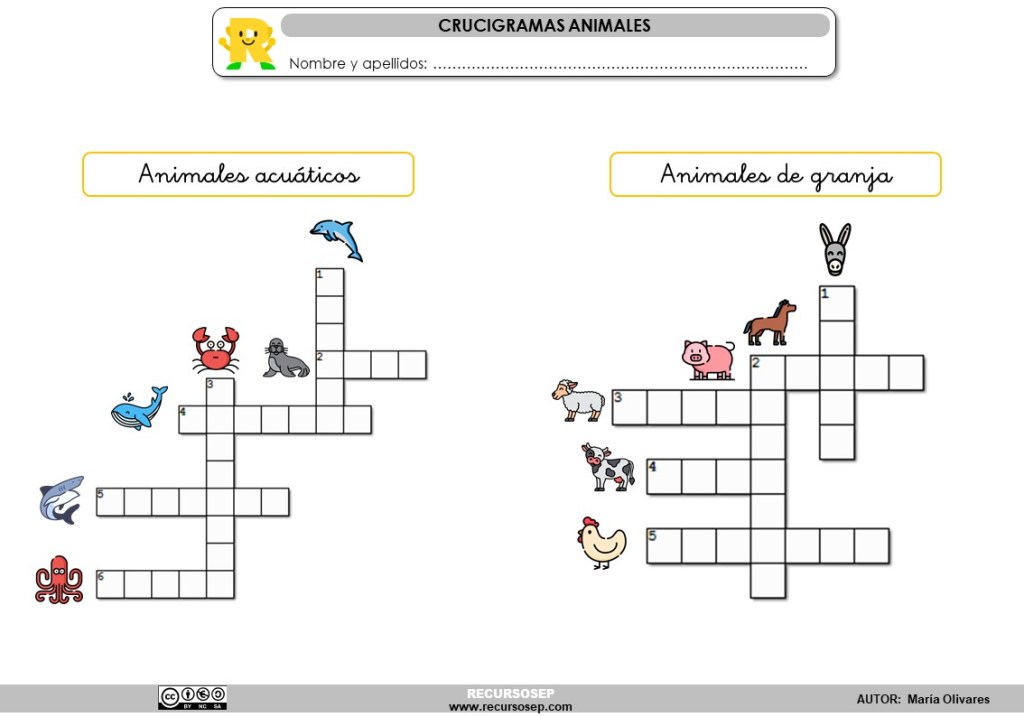 1. Los primeros crucigramas son muy sencillos porque no tienen pistas, simplemente verás el dibujo del animal y tendrás que escribir su nombre. Este en concreto es un crucigrama de animales de.