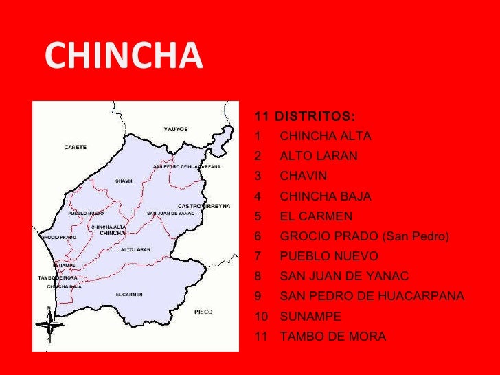La provincia de Chincha, ubicada a 188 kilómetros al sur de Lima en Perú, en el Departamento de Ica, está provincia conformada por 11 distritos y tiene una superficie de 2,988.27 km2. Una.