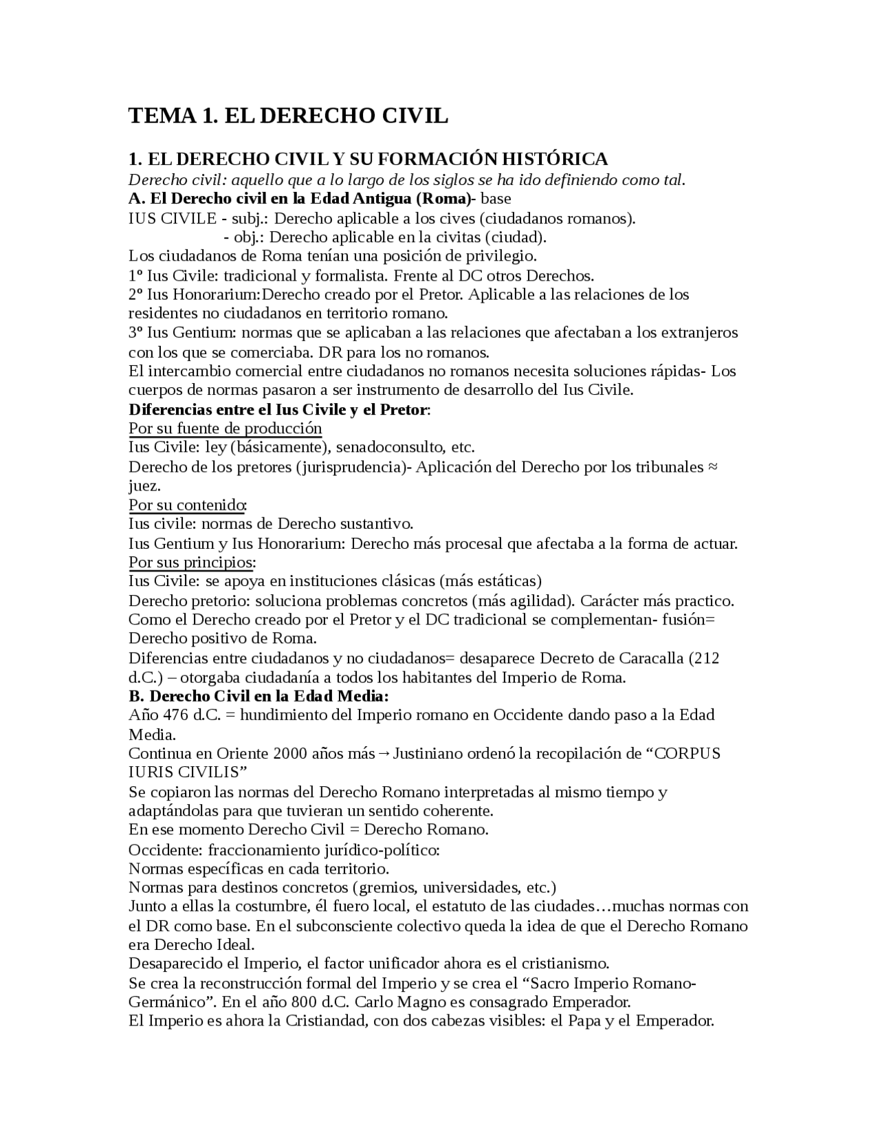 TEMA 1. EL DERECHO CIVIL 1. EL DERECHO CIVIL Y SU FORMACIÓN HISTÓRI Apuntes de Derecho Civil