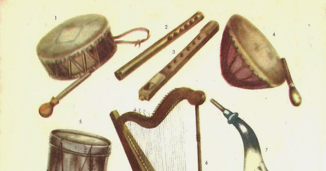 Instrumentos musicales antiguos 1 sistrum egipcio, panderetas 2,3, platillos 4, simple y doble