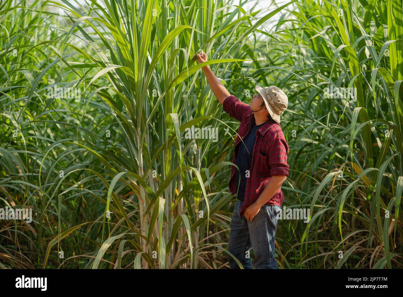 Productor de caña de azúcar que revisa la hoja de caña de azúcar en la plantación Fotografía de