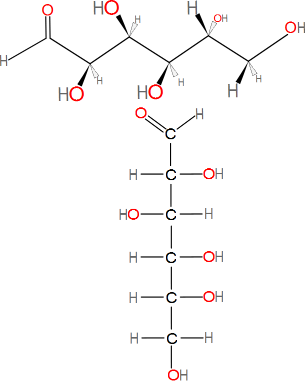 A continuación se presentan tres representaciones de la forma de cadena abierta de D-glucosa: en la proyección Fischer convencional (A), en la variación de "estructura lineal" de la proyección Fischer en la que no se muestran carbonos e hidrógenos (B), y finalmente en el estilo 'zigzag' (C) que es preferido por los químicos orgánicos.