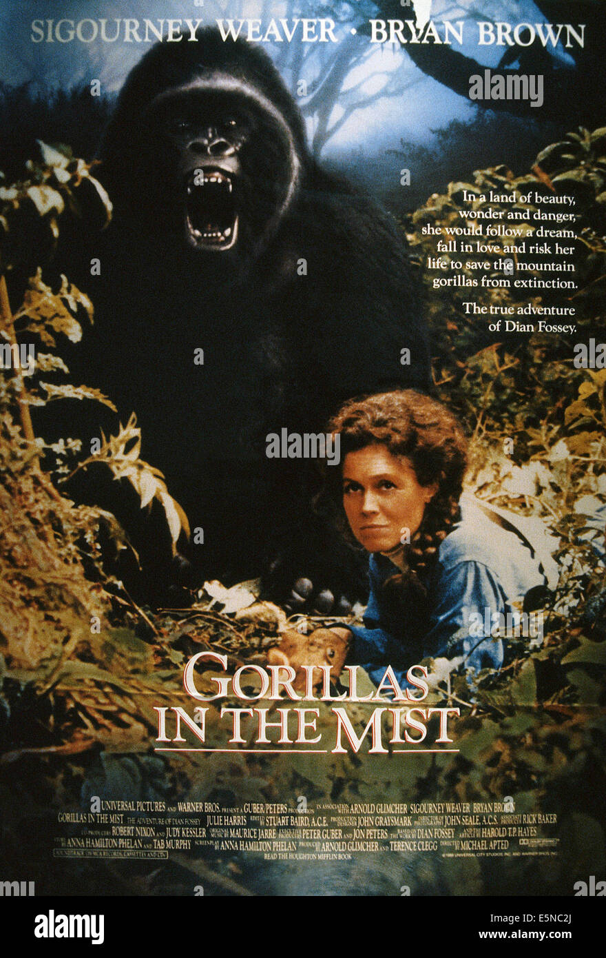 Gorilas en la niebla película dirigida por Michael Apted y protagonizada por Sigourney Weaver, Bryan Brown y Julie Harris. Año: 1988. Tema: Animales. Slogan: En los confines de la tierra encontró una razón para vivir y una causa por la que luchar. Sinopsis: La historia de Dian Fossey, una científico que llegó a África para estudiar a los gorilas de montaña en su medio natural, y más.