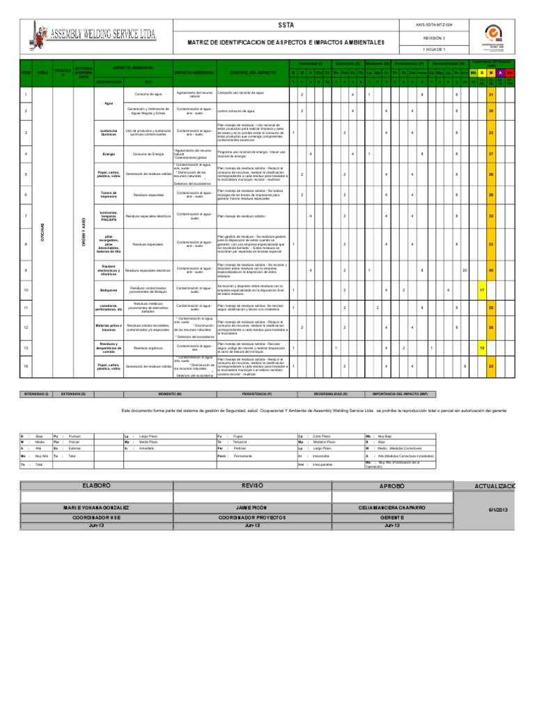 Matriz identificación aspectos e impactos ambientales. Tamaño; Matriz identificación aspectos e impactos ambientales - 2023: 73.32 KB: Agencia Nacional de Infraestructura. Dirección: Calle 24A # 59 - 42 Edificio T3 Torre 4 Piso 2 (Bogotá, D.C - Colombia) Código Postal: 111321. Horario de Atención: Lunes a Viernes 08:00 am - 05:00 pm.