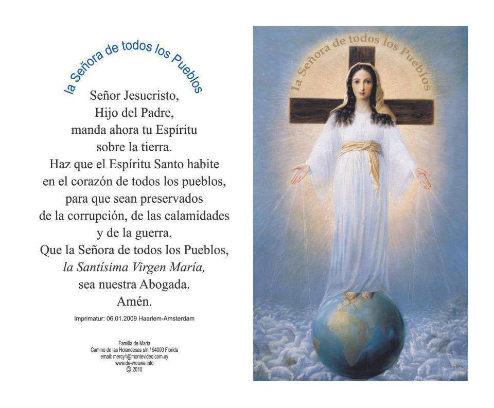 Que la Señora de todos los Pueblos, María Santísima, sea nuestra Abogada. Amen." La Stma. Virgen dictó con insistencia a la vidente esta breve y potente oración para que se proclame a María Corredentora cuanto antes y de ese modo el Espíritu Santo descienda con una nueva plenitud, como ha sido prometido. (La oración) "ha sido dada para.