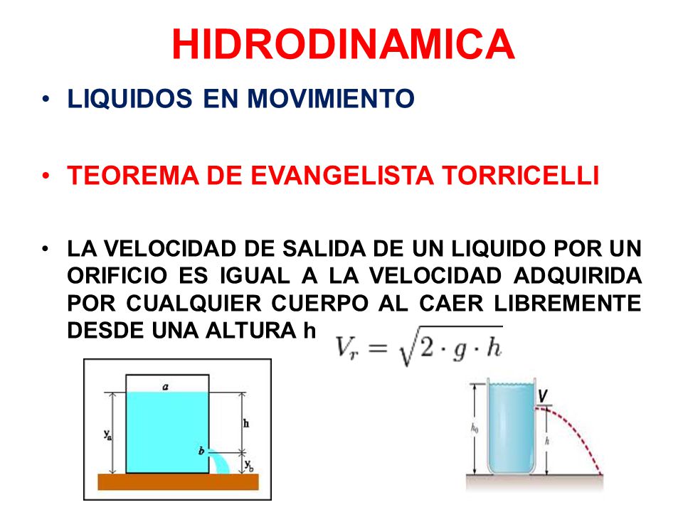 La hidrodinámica o fluidos en movimientos presenta varias características que pueden ser descritas por ecuaciones matemáticas muy sencillas. Ley de Torricelli: si en un recipiente que no está tapado se encuentra un fluido y se le abre al recipiente un orificio la velocidad con que caerá ese fluido será: v=\sqrt {2 g H}