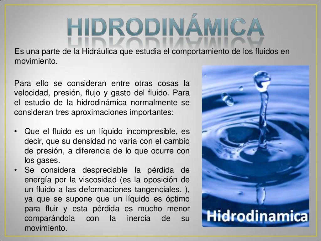 Hidrodinámica. La hidrodinámica es la rama de la hidráulica que estudia la dinámica de los fluidos . Para el estudio de la hidrodinámica se pueden considerar diferentes aproximaciones, dependiendo del problema que se vaya a abordar, como por ejemplo las siguientes: en muchos casos, los cambios de densidad en los fluidos se pueden.